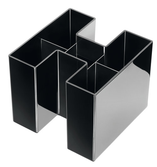 przybornik na biurko, wykonany z trwałego polistyrenu powierzchnie o wysokim połysku istnieje możliwość połączenia kilku pojemników w celu zwiększenia pojemności 4 przegrody na artykuły piszące 1 mini przegródka na spinacze stabilny - grubość ścianek 2mm wymiary: 109x109x90mm kolor czarny