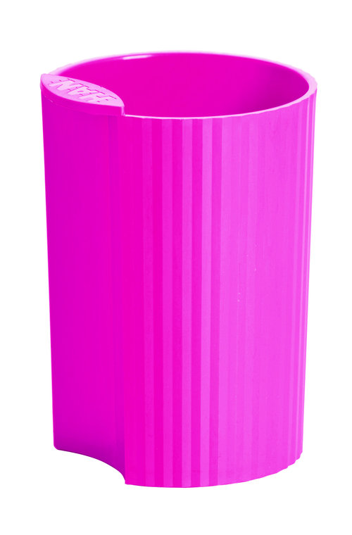 elegancki przybornik na długopisy w modnych kolorach nowoczesny kształt w części z powierzchnią karbowaną po bokach wycięcia z nakładką umożliwające łączenie kilku przyborników w tej serii dostęne również szufladka na dokumenty, kosz na śmieci, pojemnik na czasopisma wykonany z polipropylen średnica: 73mm/66mm wysokość: 100mm kolor: różowy