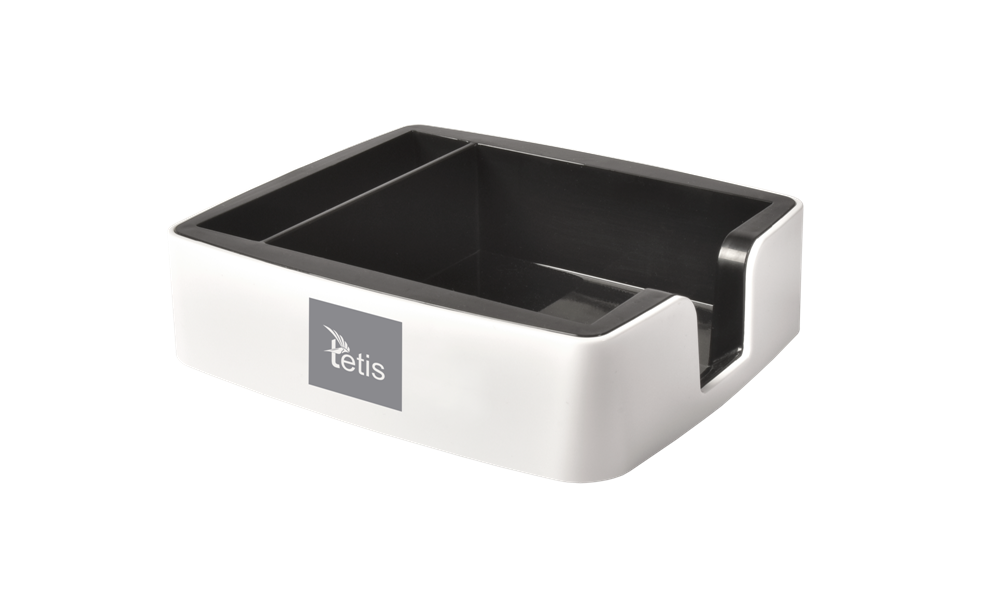 Wykonany z tworzywa sztucznego organizer. Antypoślizgowa podstawa. Pojemność wizytówek: 50 sztuk. Pojemność karteczek: 200 sztuk. Maksymalny rozmiar karteczek: 90x90 mm