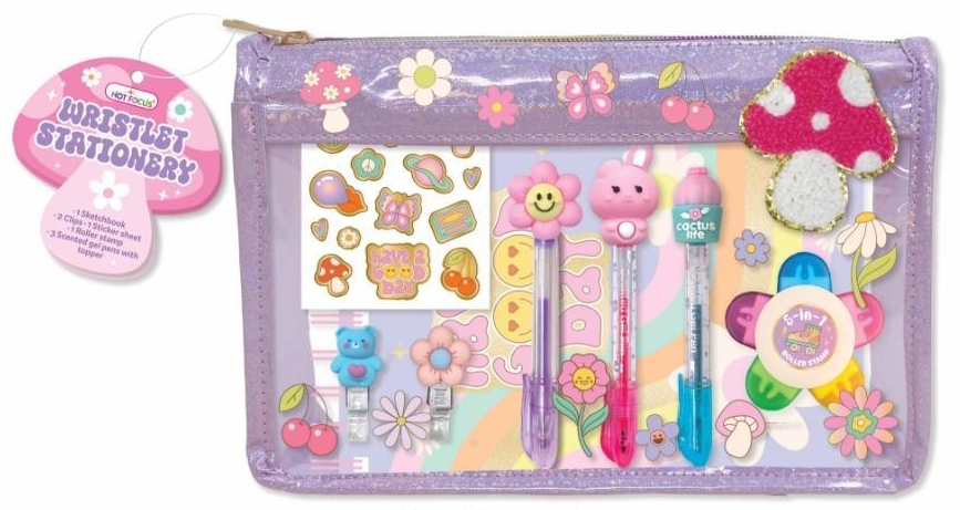 Zestaw zawiera: - kołozeszyt sketchbook - 3 długopisy żelowe z ozdobnymi nakładkami - arkusz naklejek - 2 klamerki z ozdobnymi nakładkami - pieczątki w rollerze w 5 kolorach i wzorach Zestaw zapakowany w ozdobną saszetkę zamykaną na zamek z uchwytem do wygodnego przenoszenia. Wiek: 5+
