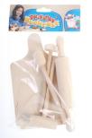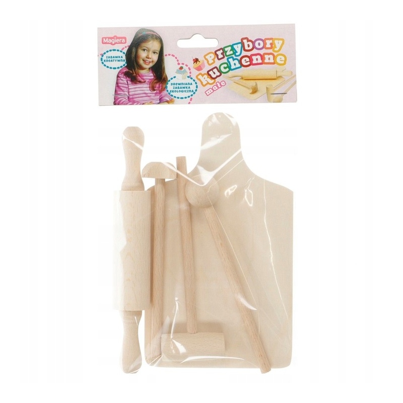 Zestaw małych przyborów kuchennych dla najmłodszych dzieci będzie dla nich świetnym prezentem a akcesoria w nim zawarte przydadzą się każdej małej gosposi . Realistyczny wygląd i kształty przyborów gwarantują fantastyczną zabawę i są okazją do pierwszych małych eksperymentów w kuchni. Przybory są starannie wykończone i bezpieczne dla dziecięcych rączek. Jest to solidna i kreatywna zabawka . Zestaw zawiera deseczkę o wymiarach (19,3 x11 cm) oraz rogalkę, tłuczek, wałek i młotek. Przybory wykonane są z wyselekcjonowanego naturalnego drewna bukowego które jest przyjazne dla środowiska.