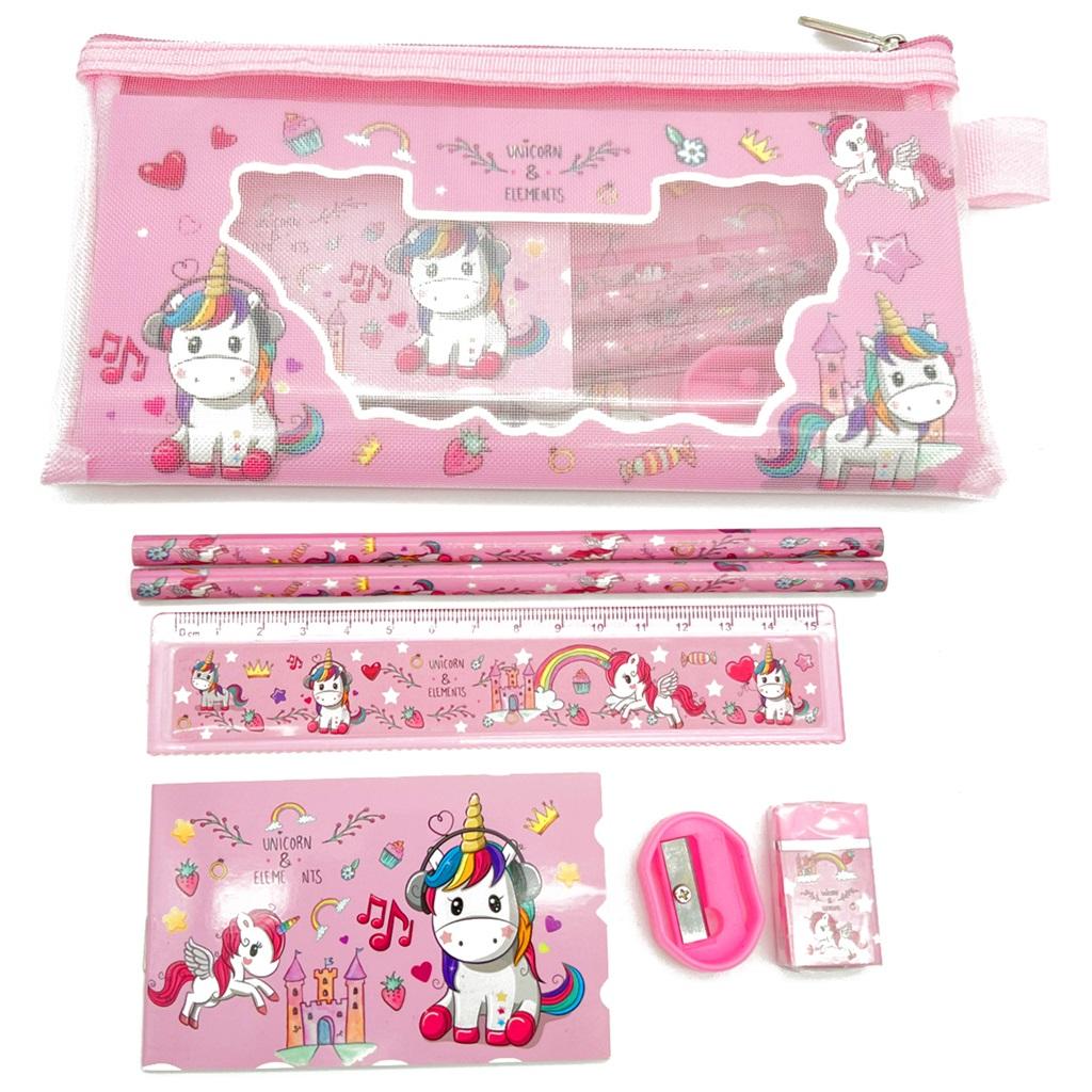 Zestaw przyborów szkolnych w skład którego wchodzą: piórnik, 2 ołówki, linijka, notesik, gumka, strugaczka.