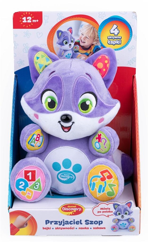 Bystre oczka, pluszowe futerko i bogate wnętrze, to właśnie on, zawodowy poprawiacz humoru, Przyjaciel Szop! Pluszak posiada cztery łapki, a każda z nich odpowiada za uruchamianie innych dźwięków. Niezależnie od tego czy maluch ma ochotę słuchać, śpiewać czy skakać, Szop wyczaruje dla niego edukacyjną zabawę. Potrafi opowiadać bajki, aktywizować, zadając najmłodszym różne pomysłowe zadania do wykonania, a także śpiewać piosenki, ucząc tym samym alfabetu, cyferek i figur.
