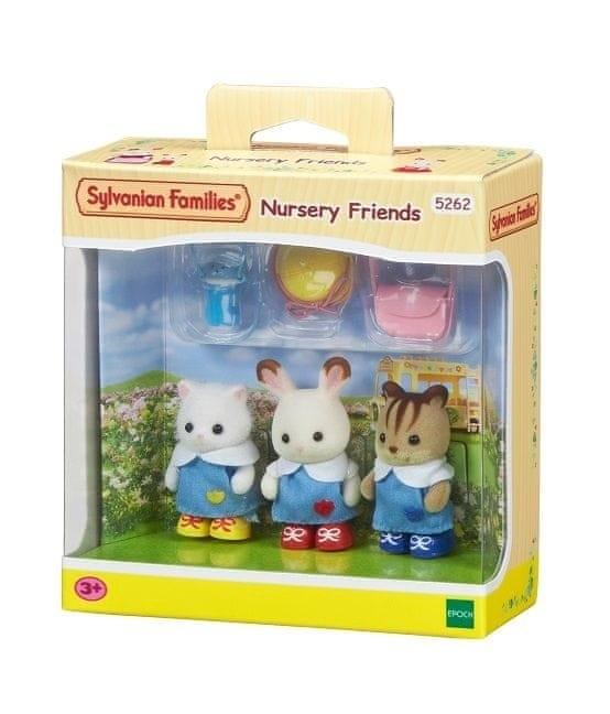 Produkty Sylvanian Families to słodkie figurki dla dzieci. Zestaw Przyjaciele z przedszkola zawiera trzy figurki maluchów: dziecko Królików z Czekoladowymi Uszkami, dziecko Wiewiórek oraz dziecko Kotków Perskich. Wszystkie figurki są ubrane w przedszkolne stroje z różnokolorowymi naszywkami. Każde dziecko nosi buty w kolorze dopasowanym do naszywki na ubraniu. Zestaw zawiera również kilka drobiazgów, które przedszkolaki mogą założyć lub nosić: kapelusz, bidon oraz przedszkolną torebkę na ramię. Połącz zestaw z innymi zestawami przedszkolnymi, jak Leśne przedszkole oraz Przedszkolny autobus piętrowy (sprzedawanymi osobno).