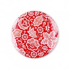 Przypinka do ubrania, plecaka czy torby z ludowym motywem kujawskim kojarzona także jako button. Okrągły znaczek z folk wzorem inspirowany jest tradycyjnymi haftami kujawskimi. Motywem przewodnim wśród kujawskich wzorów są ornamenty roślinne w różnych stylizacjach: formy proste, motywy kwiatów (np. margaretki, słoneczniki, róże) i liści, motywy gałązek.