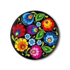 Czarna przypinka do ubrania, plecaka czy torby z ludowym motywem łowickim kojarzona także jako button. Okrągły znaczek z folk wzorem inspirowany jest tradycyjnymi wycinankami łowickimi - najbardziej rozpoznawalnym symbolem polskiego folkloru. Podstawowymi elementami wycinanek łowickich są koguty, pawie oraz motywy kwiatowe. Wycinanki tworzone są ręcznie z kolorowego papieru, a sztuka ta przekazywana jest z pokolenia na pokolenie. Elementy kwiatów oraz kogutów łowickich można znaleźć w łowickich stylizacjach zaprojektowanych przez Folkstar.