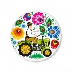 Ludowe przypinki z folkowymi wzorami łowickimi folk przypinka z kwiatami łowickimi i traktorkiem