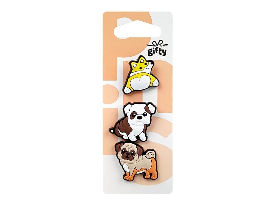 "Radość w małym detalu. Silikonowy zestaw przypinek Gifty z motywem psów oferuje zabawne wzory, które łatwo pokochasz i które nadadzą akcesoriom osobistego charakteru.