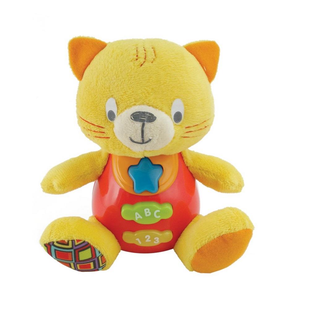 Przytulaczek kotek Miauczek z serii Moi przyjaciele. Mówi po polsku. Na brzuszku ma przyciski: literki cyferki melodyjki światełka. Wiek 3m+