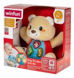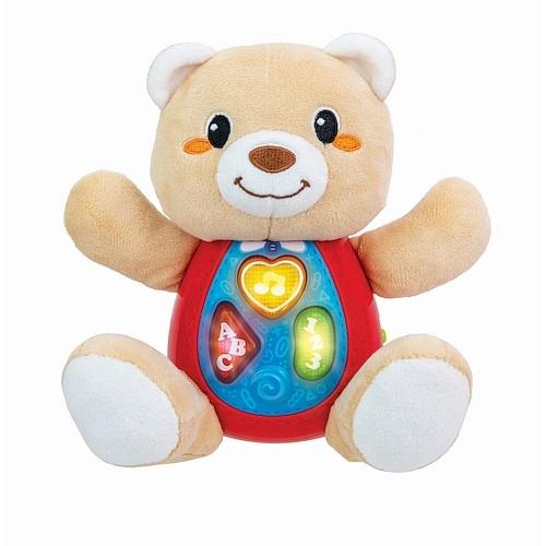Miś jest jednym z przytulaczków. Na swoim brzuszku posiada trzy kolorowe przyciski funkcyjne, które uruchamiają różne melodie oraz uczą dzieci podstawowych cyfr i liter. Dodatkowo posiada mięciutką główkę i stópki.
