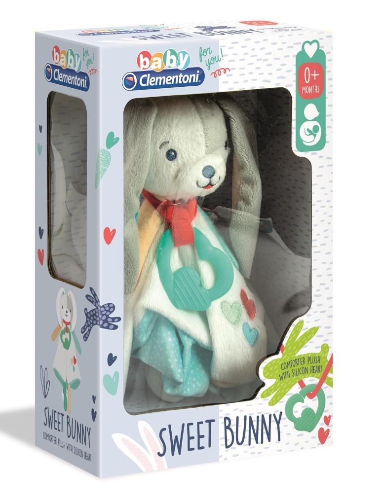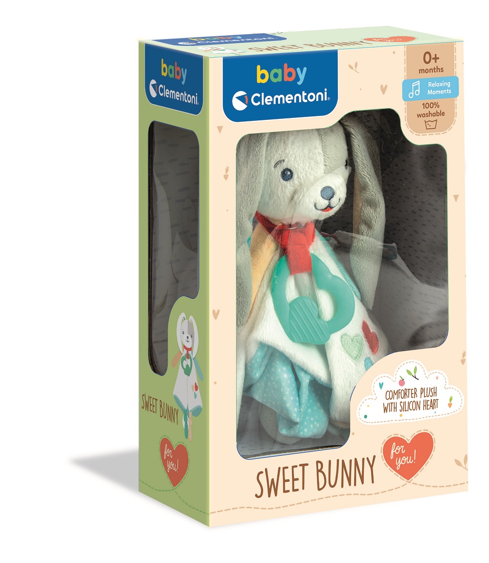 Ta wyjątkowo miękka przytulanka w postaci króliczka zostanie pierwszym towarzyszem zabawy i snu Twojego dziecka. Przytulankę uszyto z hipoalergicznego, puszystego materiału, który posiada wyjątkową zdolność pochłaniania zapachów, co uspokoi dziecko, kiedy będzie samo. Mama będzie mogła „zostawić” swój zapach na przytulance, która będzie towarzyszyła dziecku w ciągu dnia, stając się jego ulubionym towarzyszem snu i zabawy. Znajdująca się na przytulance silikonowa zawieszka stanowi wspaniały dodatek, który mama może nosić przy sobie, dając go dziecku do gryzienia, kiedy leży w jej ramionach. Zawieszki można także używać podczas karmienia piersią, aby pobudzić sprawność manualną dziecka.