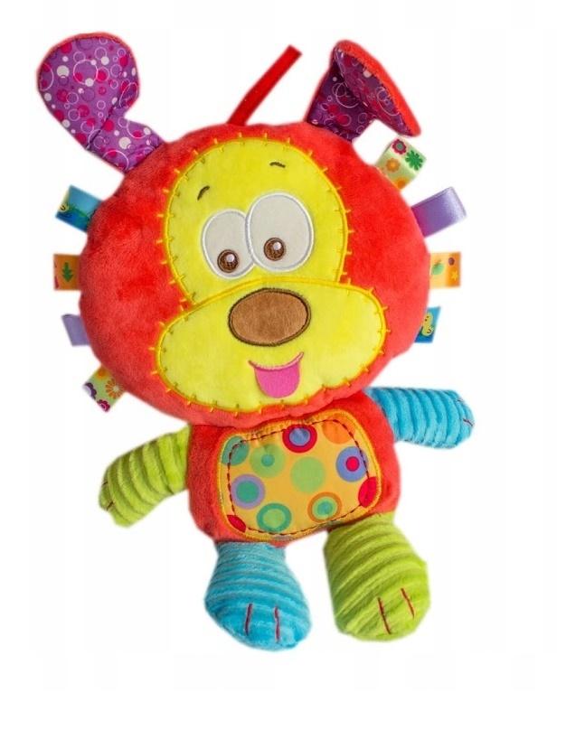 Pluszak (35 cm) ma wszystą w brzuszku grzchotkę i piszczek, a żywe kolory i różnorodność faktur tkaniny dostarczają maluchowi optymalną ilość wrażeń dotykowych.