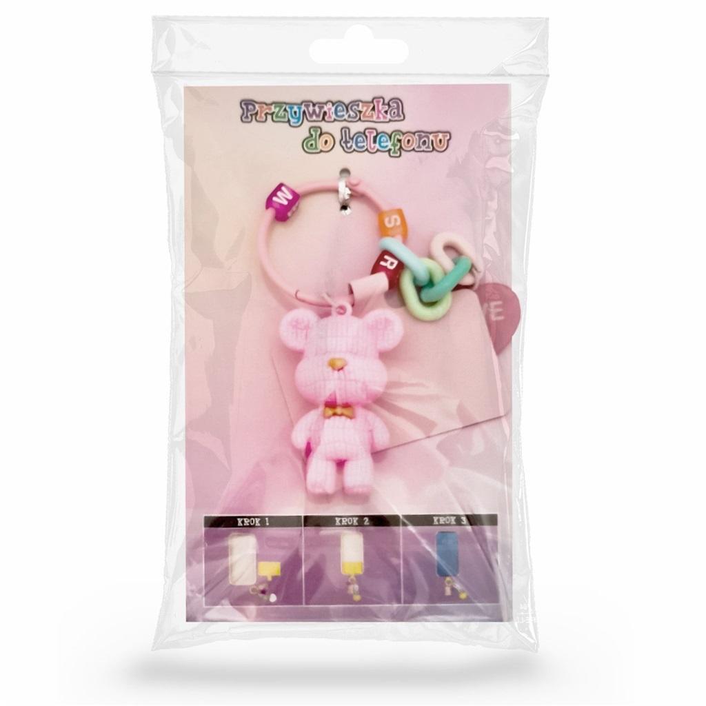 Przywieszka do telefonu. Róż. Miś. Przywieszka wyposażona jest w miękką, prostokątną wkładkę, którą umieszcza się pod obudową/etui telefonu na dole przy wejściu do ładowania. Pętelkę, którą zakończona jest prostokątna wkładka należny przełożyć przez dziurę w obudowie/etui telefonu przeznaczoną na kabel ładujący. Pętelka jest płaska, więc nie przeszkadza w ładowaniu telefonu.
