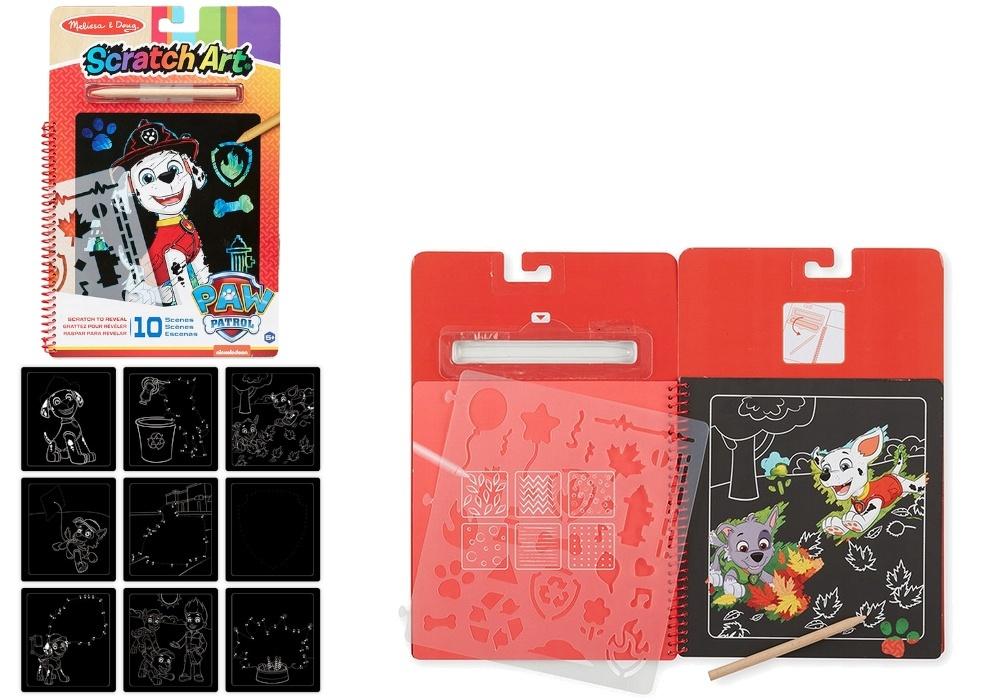 Melissa & Doug Scratch Art PAW Patrol Marshall to edukacyjny zestaw plastyczny do samodzielnego tworzenia ilustracji za pomocą techniki zdrapywania. Produkt zawiera książeczkę spiralnie bindowaną z dziesięcioma stronami typu scratch-art, z czarną warstwą wierzchnią i ukrytymi kolorowymi ilustracjami przedstawiającymi bohaterów serii Psi Patrol. Do zestawu dołączono drewniany rysik do zdrapywania oraz arkusz szablonów z wzorami, które można odrysować i zdrapać według własnego pomysłu.