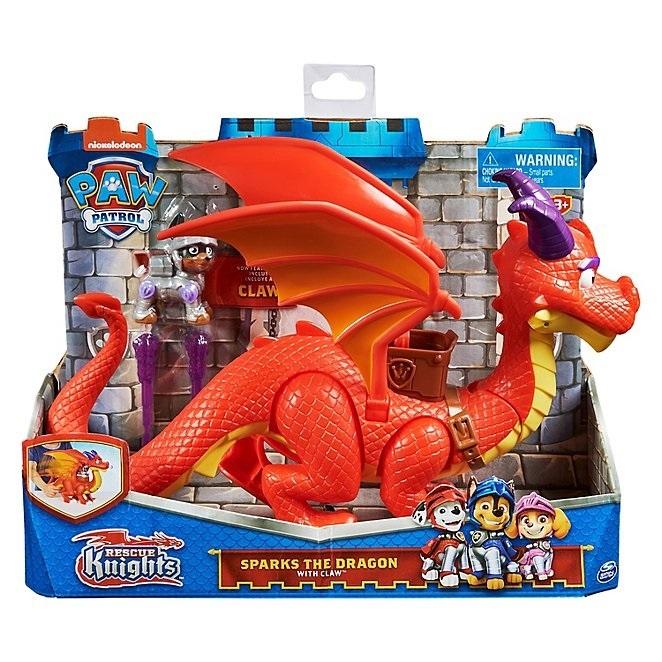 Przygotuj się na średniowieczne misje Odważnych Rycerzy w Barkinngburg z dużym zestawem Claw i Sparks! Ten zestaw zawiera wyjątkową figurkę szczenięcia Claw i dużą figurkę smoka Sparks z jego superskrzydłami, dwoma pociskami i siodłem, w którym może siedzieć Claw! Zarówno Sparks, jak i Claw zostali wykonani z dbałością o detale, dokładnie tak jak postacie z serialu! Kiedy nadejdzie pora lotu, skorzystaj z klipsu na siodle, aby Claw utrzymał się na miejscu, po czym naciśnij przycisk na ogonie Sparksa, aby ten zaczął machać skrzydłami. Spraw, aby smok razem ze szczeniakiem uniósł się w powietrzu, dokładnie tak jak w serialu! Naciśnij rogi Sparksa, aby ten wystrzylił pociskami przypominającymi ognisty oddech. Jeśli szukasz jeszcze więcej sposobów na to, aby przeżyć swoje ulubione sceny z Psiego Patrolu, szukaj szczeniaków i smoków z serii Odważni Rycerze oraz kwatery głównej w zamku (figurki i zestaw sprzedawane osobno). Ten ekscytujący zestaw to doskonały sposób na poszerzenie kolekcji Psiego Patrolu i pobudzenie wyobraźni poprzez ekscytującą zabawę. Przenieś do domu smoczą zabawę dzięki zestawowi Psi Patrol Odważni Rycerze - Sparks i Claw!