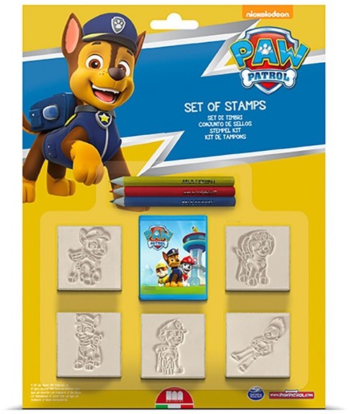 Pieczątki na licencji Psi Patrol. W skład zestawu wchodzi: 5 pieczątek, 1 poduszeczka do tuszu oraz 3 kredki. Dla dzieci w weku od 3 lat