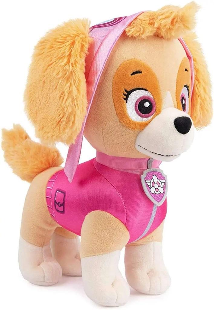 Bohaterski stojący pluszak skye: ten pluszak (30,5 cm) przedstawia skye ubraną w jej charakterystyczny różowy mundur pilota, w komplecie z goglami, odznaką drużyny psiego patrolu, oklapłymi uszami i super miękkim pluszowym futerkiem. Każdy szczeniak stoi wyprostowany w bohaterskiej pozie i czujnie wyczekuje kolejnej przygody.