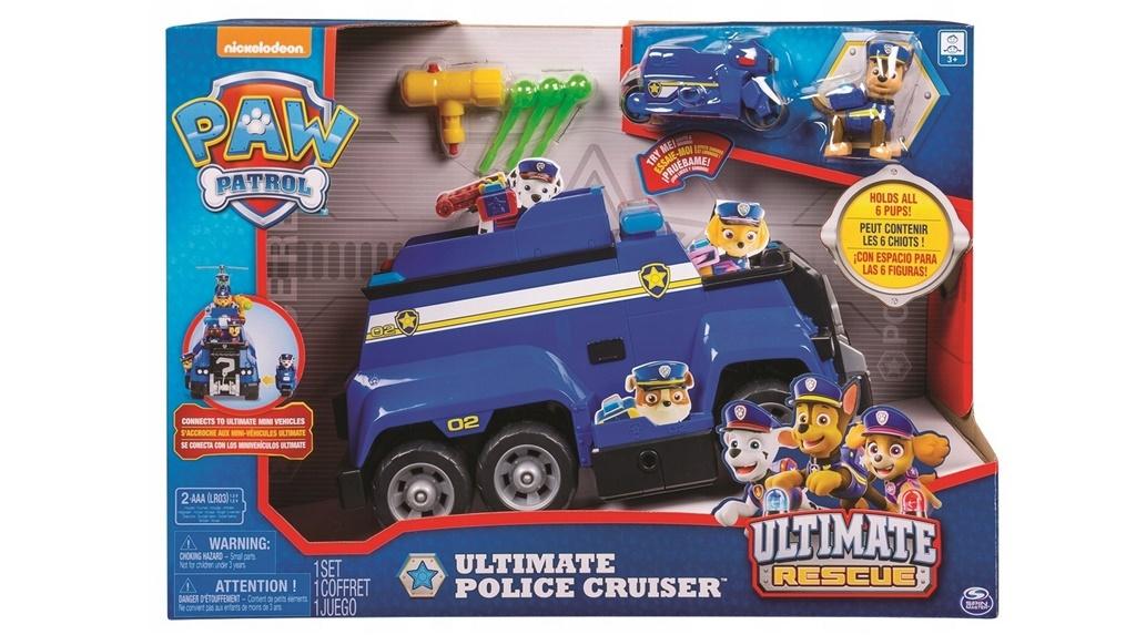 Chase dowodzi akcją! Dołącz do radiowozu ratunkowego Chasea! W pojezdzie zmieści się aż 6 psiaków - jedna figurka jest dostępna w zestawie, radiowóz wyposażony jest w wyrzutnię dysków, hak ratunkowy i mini motocykl policyjny. Przygoda zaczyna się, kiedy Chase zasiada na kierownicą pojazdu i jest gotowy do akcji! Przyciśnij specjalną odznakę Psiego Patrolu aby aktywować światła i dźwięki ostrzegawcze.