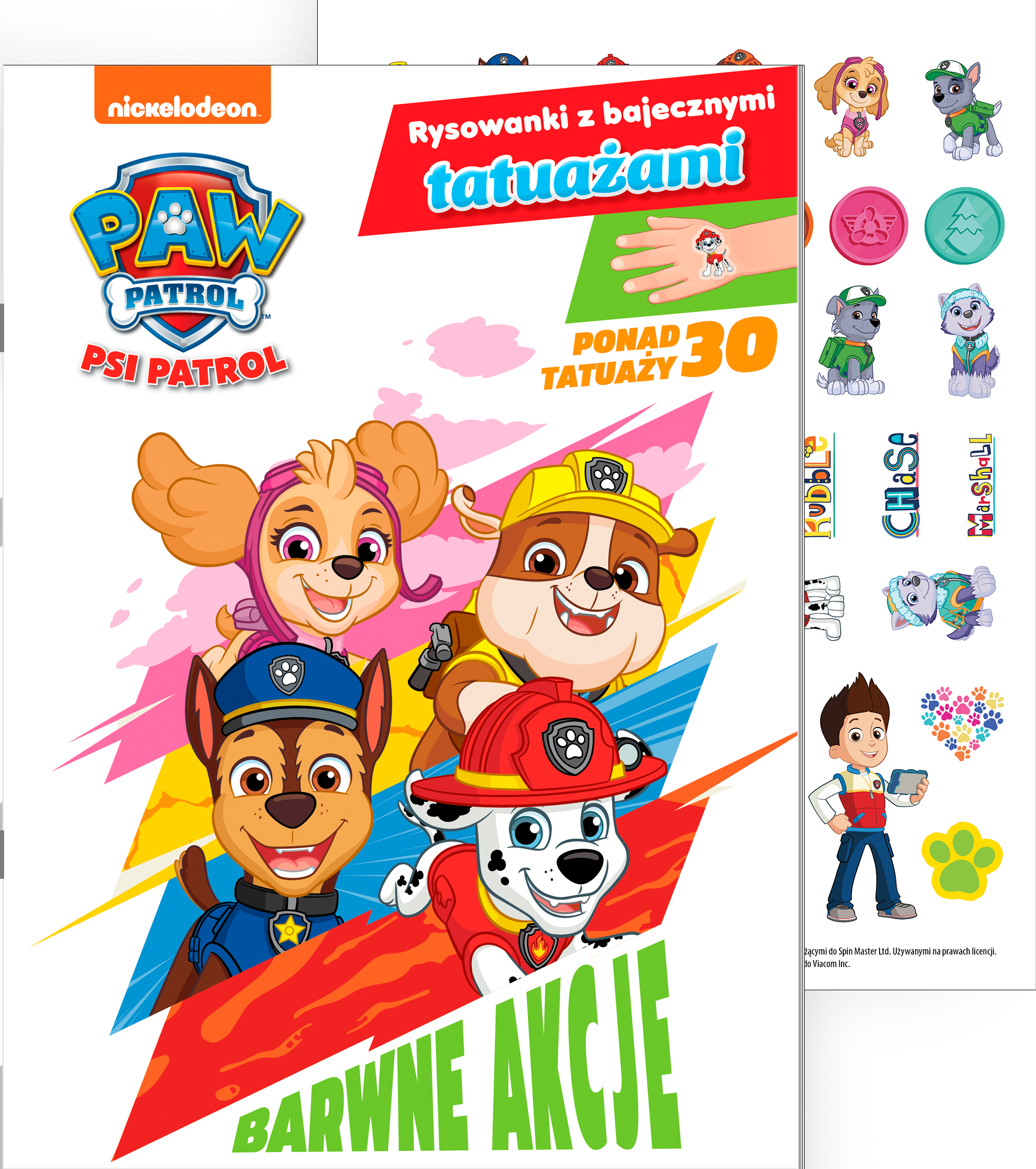 Rysowanki z bajecznymi tatuażami to fantastyczna książka z ulubionymi bohaterami, w której dziecko znajdzie wiele kolorowanek i zadań do wykonania. Do publikacji dołączone są, uwielbiane przez maluchy, zmywalne tatuaże, które wywołają uśmiech na twarzy każdego fana dzielnych piesków z Psiego Patrolu!