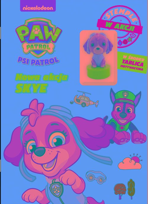 Psi Patrol. Stemple w akcji to fantastyczna książka dla każdego fana dzielnych piesków. W środku na malucha czekają zagadki, kolorowanki, zadania logiczne i łamigłówki, w rozwiązywaniu których pomocny będzie dołączony do książki stempel z nieustraszoną Skye. Publikacja pobudza wyobraźnię, spostrzegawczość i umiejętność analizy. Książka stanowi wspaniałą propozycję na kreatywne spędzenie czasu w towarzystwie ulubionych bohaterów. Świetna zabawa gwarantowana!
