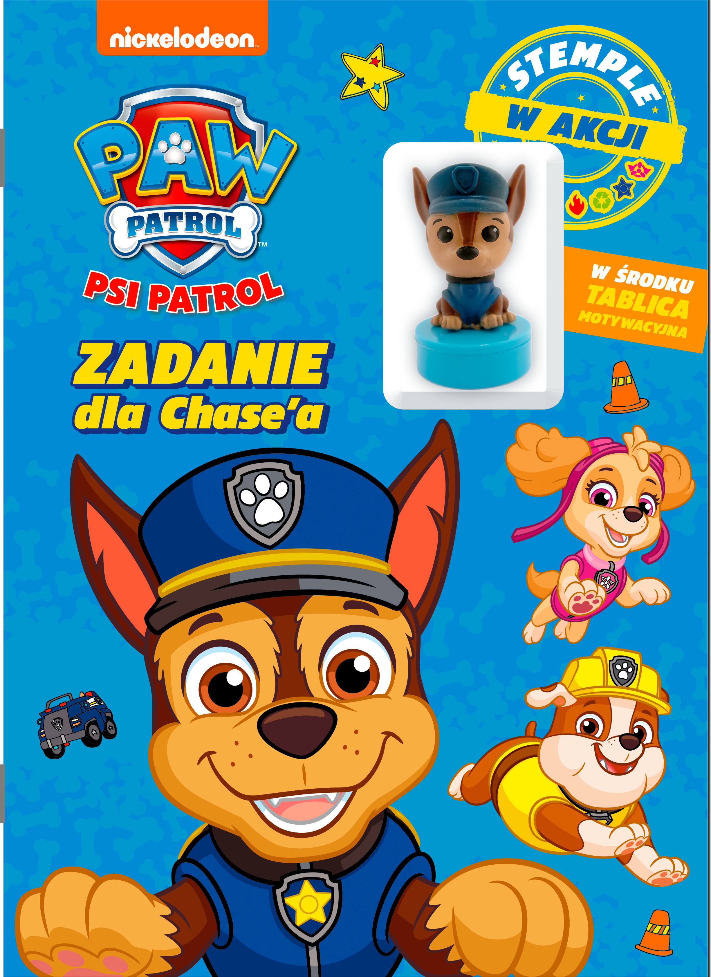 Psi Patrol. Stemple w akcji to fantastyczna książka dla każdego fana dzielnych piesków. W środku na malucha czekają zagadki, kolorowanki, zadania logiczne i łamigłówki, w rozwiązywaniu których pomocny będzie dołączony do książki stempel z nieustraszonym Chase'em. Publikacja pobudza wyobraźnię, spostrzegawczość i umiejętność analizy. Książka stanowi wspaniałą propozycję na kreatywne spędzenie czasu w towarzystwie ulubionych bohaterów. Świetna zabawa gwarantowana!