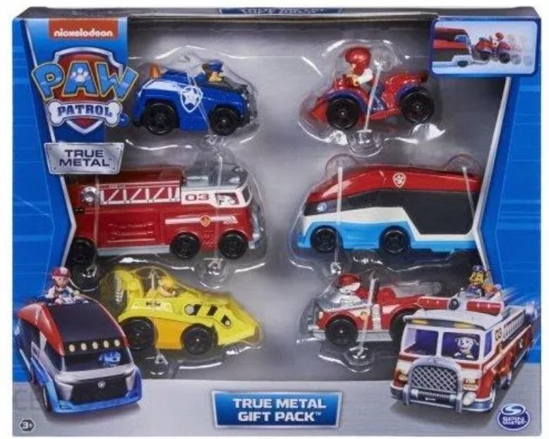 Ścigaj się na ratunek z zestawem podarunkowym True Metal PAW Patrol! W zestawie zarówno Patrolowiec PAW, jak i Wóz Strażacki Ultimate! W tym dużym zestawie pojazdów drużynowych znajdziesz także Chase'a, Rydera, Marshalla i Rubble'a w ich pojazdach w skali 1:55, z których każdy można załadować bezpośrednio na tył pojazdów drużynowych! Kiedy nadejdzie czas na pełną napięcia misję ratunkową, opuść rampę ładunkową z tyłu każdego pojazdu drużynowego i załaduj jeden z czterech pojazdów w skali 1:55 na rampę i do pojazdów drużynowych, a następnie zamknij rampę i ruszaj na ekscytujące misje ratunkowe! Dzięki zabawkom PAW Patrol dzieci mogą odkrywać swoją wyobraźnię i rozwijać umiejętności motoryczne poprzez zabawę w odgrywanie scenek, przeżywając ulubione momenty z serialu i filmu Paw Patrol lub tworząc zupełnie nowe przygody! Ruchome figurki PAW Patrol, samochody zabawkowe, zestawy do zabawy i pluszaki to idealne zabawki dla chłopców i dziewczynek w wieku od 3 lat, więc ruszaj na ratunek z zestawem prezentowym Patrolowiec True Metal i Pojazdem drużynowym Wóz strażacki Ultimate!