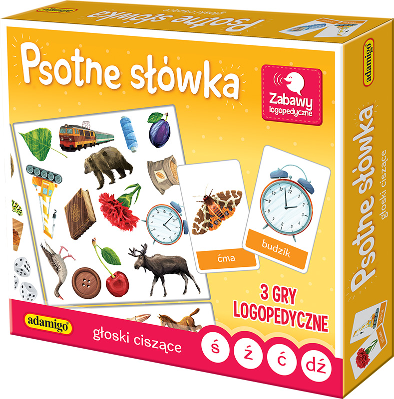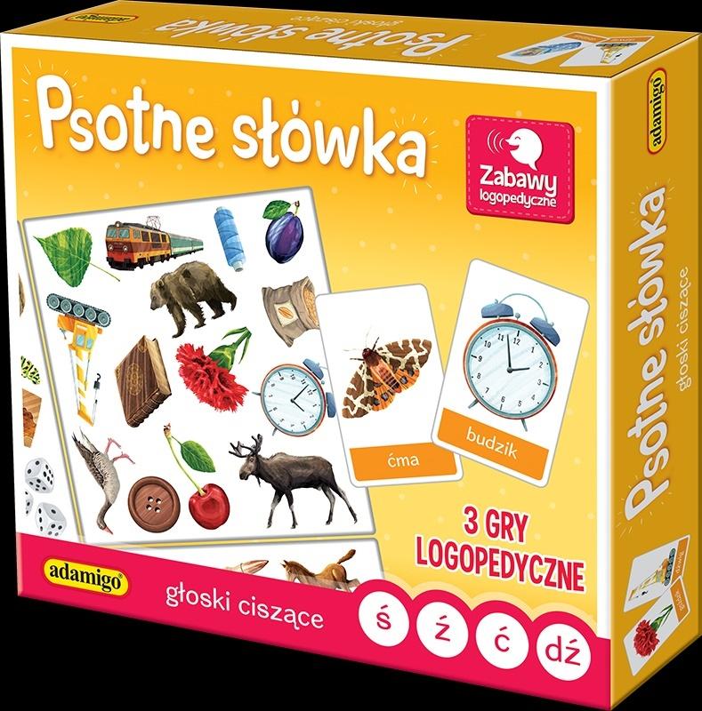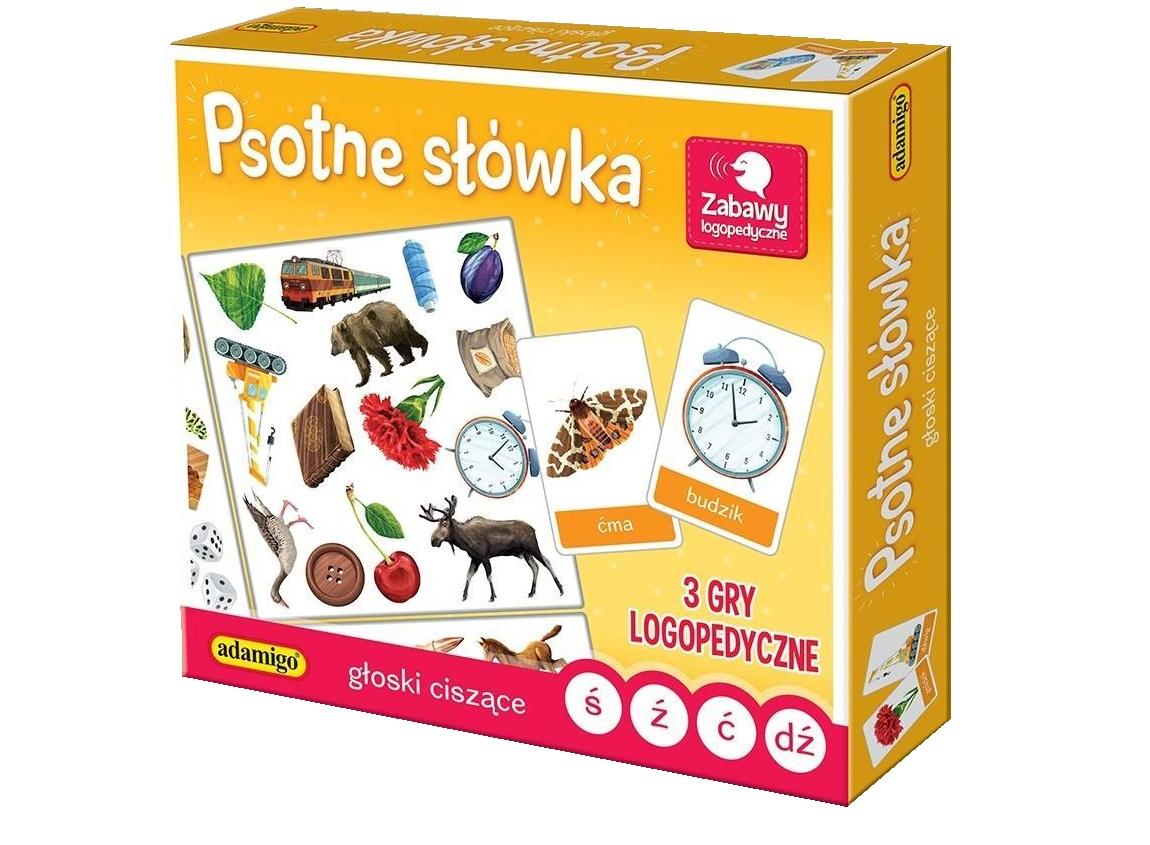 Seria gier PSOTNE SŁÓWKA przeznaczona jest dla wszystkich, którzy chcą doskonalić prawidłową wymowę trudnych głosek. Psotne polskie słowa często sprawiają najmłodszym wiele trudności. Dzięki grze ćwiczenia logopedyczne staną się przyjemnością.