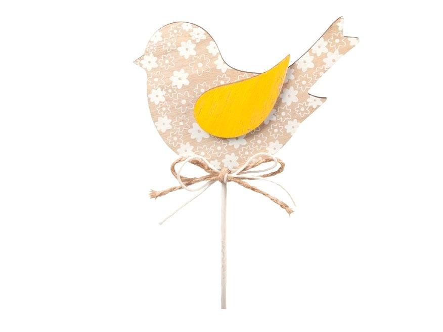 Drewniany ptak na piku. Można nim doskonale udekorować wielkanocne pudełka lub kwiaty w wazonie.