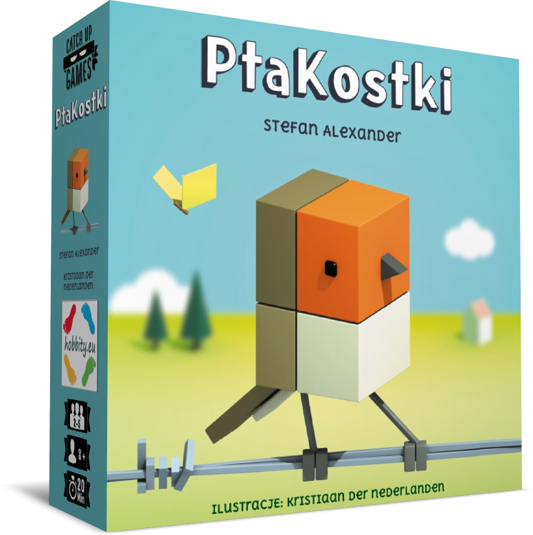 Jest to szybka gra karciana oparta na mechanice "set collection". Naszym celem jest zebranie zestawu kart przedstawiającego 7 różnych gatunków ptaków lub dwa różne zestawy kart po 3 ptaki w każdym. Chcąc to uczynić, należy odpowiednio zagrywać i dobierać karty, niejednokrotnie wybierając nieoczywiste rozwiązania tak, aby przechytrzyć przeciwników. Jednak jeden ptaszek gry nie czyni, więc w PtaKostkach znajdziecie aż 8 różnych gatunków ptaków. Wiek graczy: 8+ Liczba graczy: 2-5 Czas rozgrywki: 20 minut