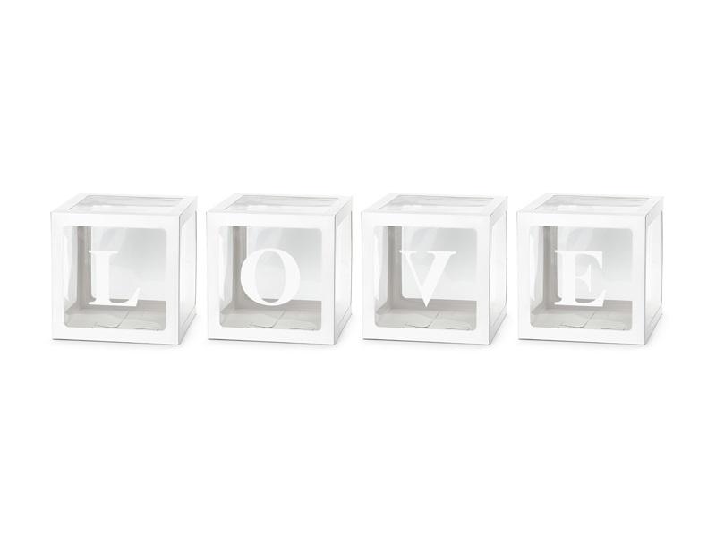 Zestaw 4 pudełek na balony oraz naklejane literki LOVE w kolorze białym. Pudełka o wymiarach 30 x 30 cm. Produkt do samodzielnego złożenia.(1 op. / 4 szt.)