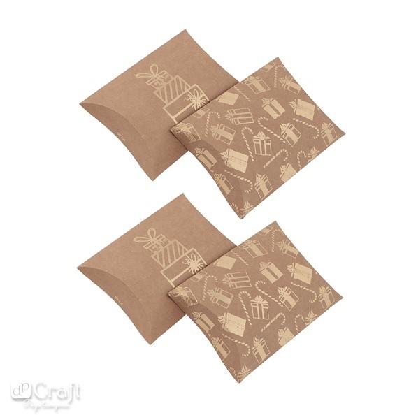 Pudełka składane typu pillow box z motywem złotych prezentów sprawdzą się doskonale jako opakowania na świąteczne podarunki. Można schować do nich rozmaite, drobne upominki takie jak biżuteria lub vouchery podarunkowe. Te tekturowe pudełka nadają się także do dodatkowego zdobienia np. elementami florystycznymi, wstążeczkami lub naklejkami Pudełeczka są do samodzielnego złożenia.