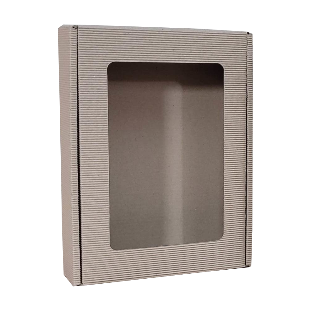Pudełko z wklejonym okienkiem o wymiarach wys 23,1 cm szer 17,6 cm głęb 5 cm z tektury falistej Eko 481g.