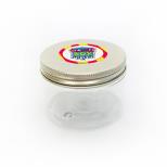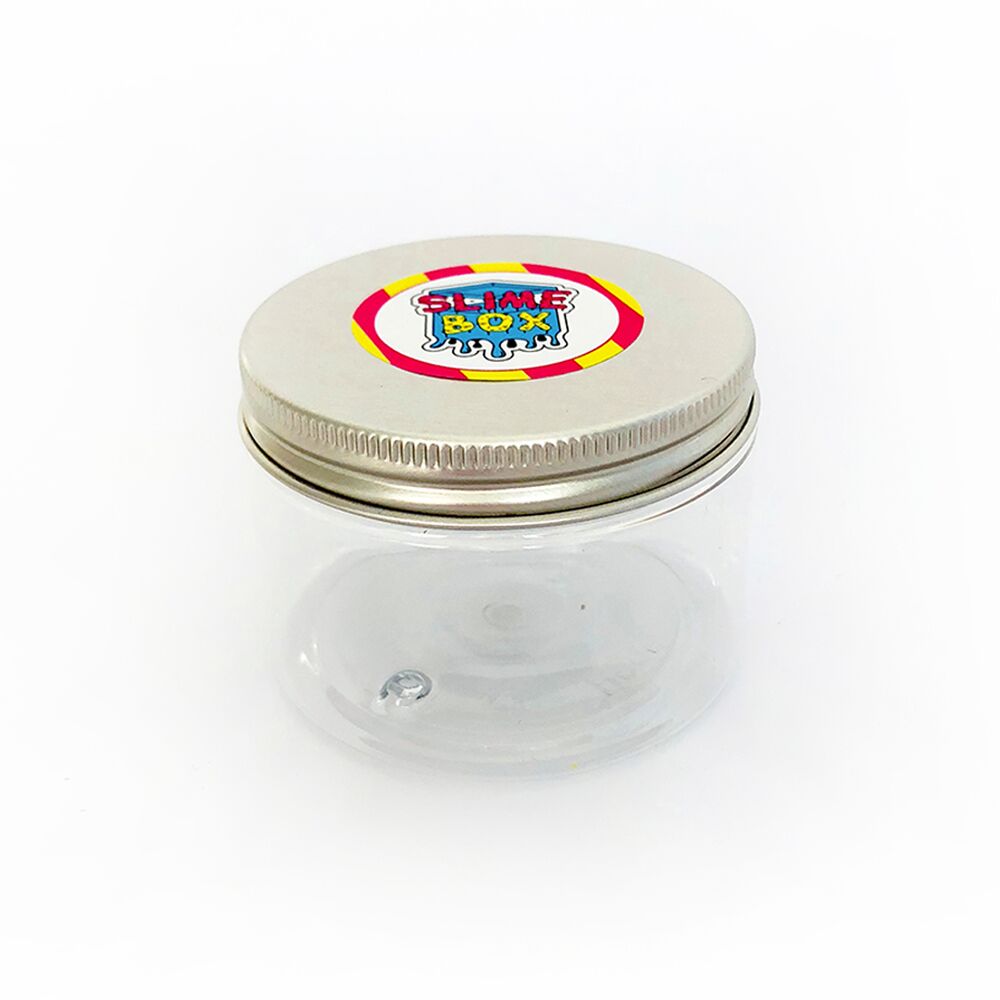 Plastikowe pudełko PET 150 ml z aluminiową srebrną nakrętką i naklejką SLIMEBOX.