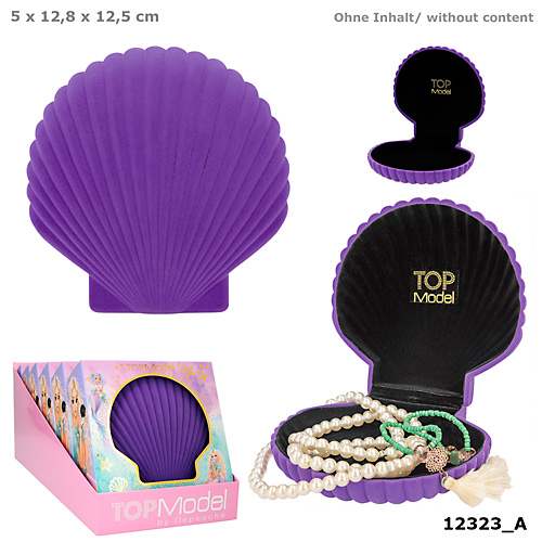 Pudełko na biżuterię muszla Top Model. Pudełko w kształcie muszli, welwetowe wykończenie w środku i na zewnątrz. Idealne na drobne skarby. Pakowane w tekturowe pudełko z przezroczystym frontem. Wymiary jak na zdjęciu.