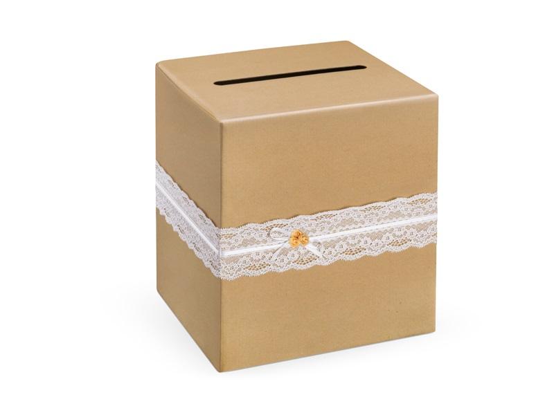 Pudełko na telegramy z naturalnego papieru w kolorze brązowym, z koronką i jasnoróżowymi różyczkami. Kolekcja Vintage, wymiary pudełka po złożeniu 24x24x24 centymetry.