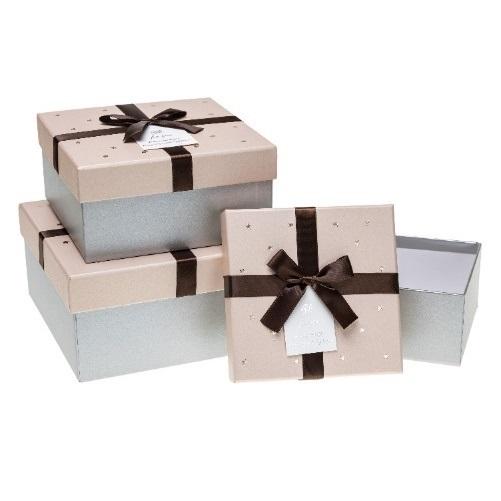 Zestaw pudełek prezentowych kwadratowych 3szt, motyw łososiowo-szary z brokatem