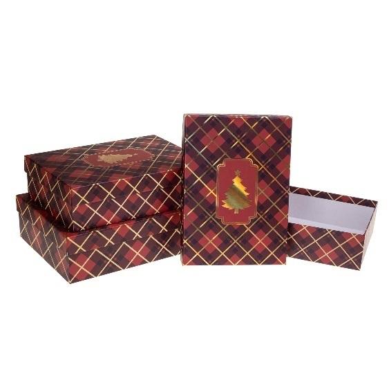 Zestaw pudełek prezentowych 3szt, motyw świąteczny z kratą i choinką.