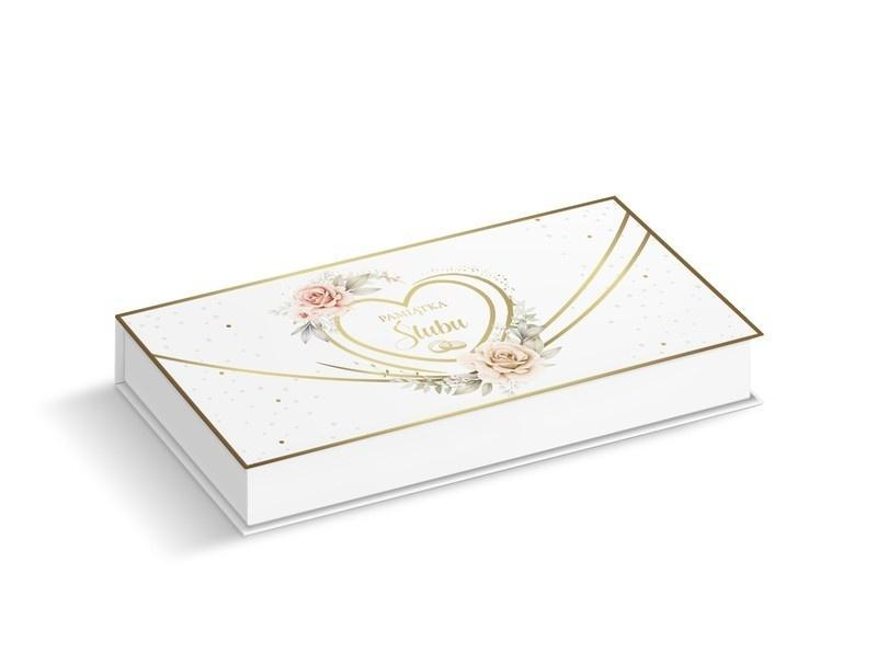 Ozdobne Pudełko PD Pamiątka Ślubu - to doskonały sposób na estetyczne i wyjątkowe zapakowanie banknotu lub karty podarunkowej. Jego klasyczny design podkreślają złote zdobienia, które dodają mu szyku i podniosłego charakteru. Magnetyczne zamknięcie sprawia, że pudełko można wielokrotnie otwierać i zamykać, a starannie dobrane życzenia w środku czynią je idealnym wyborem na szczególne okazje. Wymiary produktu: 18 cm x 9 cm Zamknięcie: magnetyczne Wnętrze: eleganckie życzenia w środku