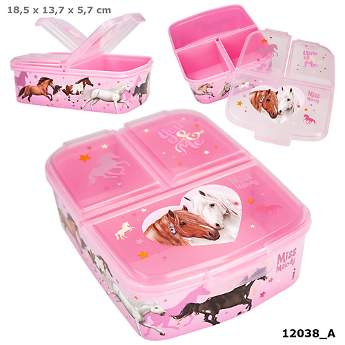 Śliczne pudełko śniadaniowe Miss Melody z przegródkami. Podział na trzy komory. Pokrywkę można zdjąć. Producent zaleca mycie ręczne. Bez BPA i ftalanów. Idealne na szkolną kanapkę i przekąski. Wymiary: 18,5x13,7x5,7cm.