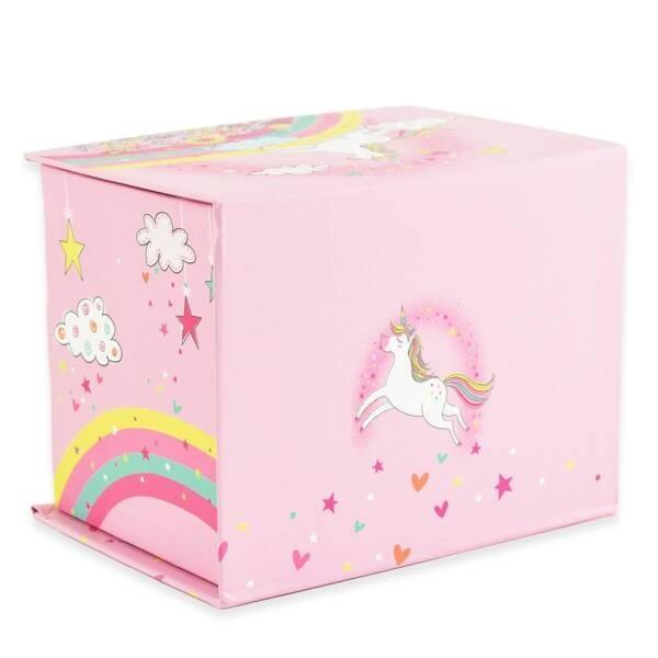 Pudełko z lusterkiem to przepiękna szkatułka na biżuterię. Jest bardzo dobrze wykonana, a motywem przedwonim jest jednorożec i jego bajkowe otoczenie : tęcza, kwiaty, gwiazdy. Na uwagę zasługują drobne dekoracyjne uchwyty. Po otwarciu pudełka znajduje się w nim dużo miejsca na schowanie biżuteryjnych skarbów oraz lusterko. Specjalne przegródki i szufladki spełnią wymagania małej księżniczki.