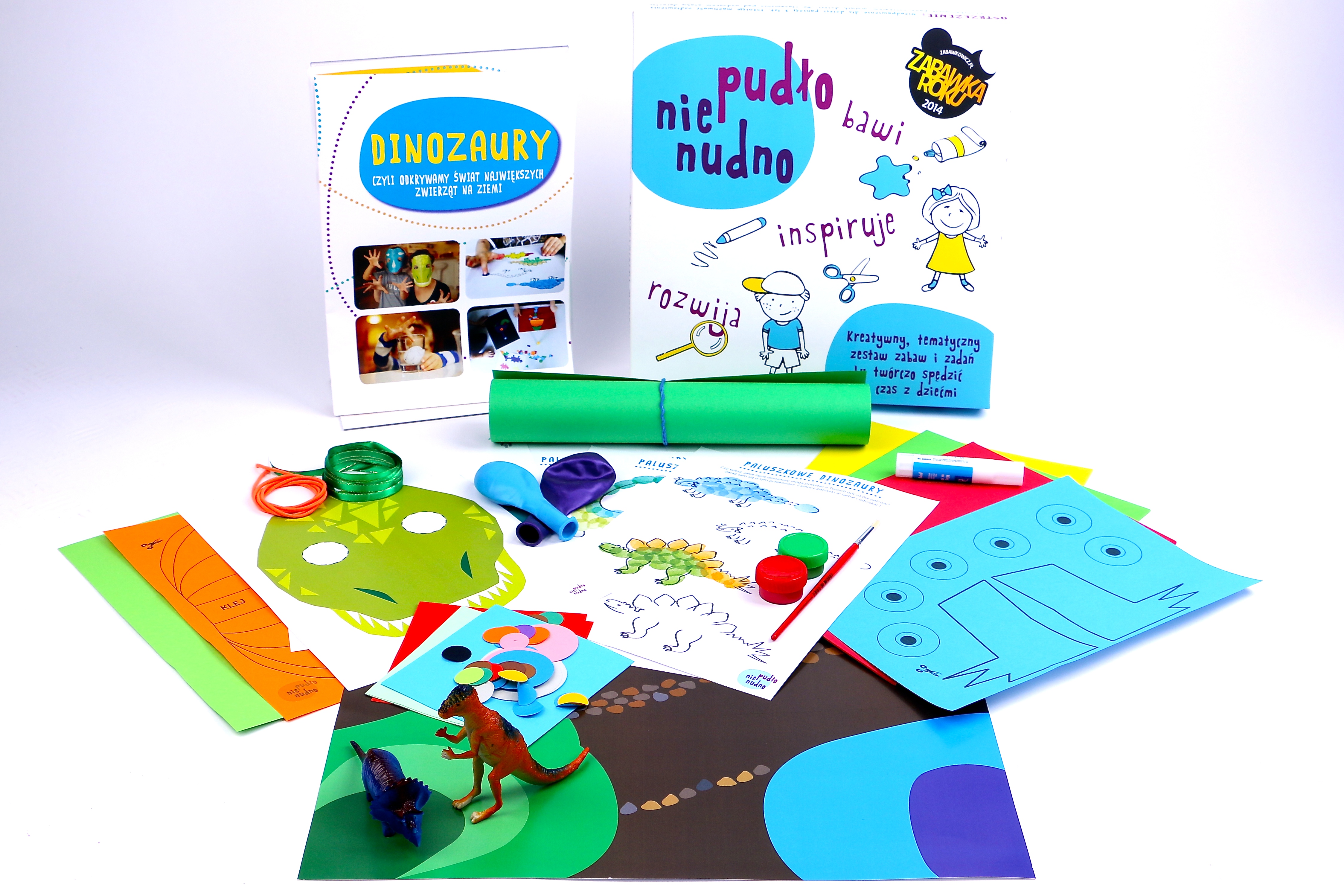 3. zestaw wszystkich niezbędnych akcesoriów i materiałów do wykonania zadań/zabaw (m.in.. farby, pędzel, pianki pvc, naklejki, balony, kleje, miniaturki dinozaurów, papier do origami, maski, itp.);