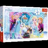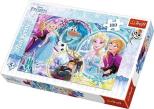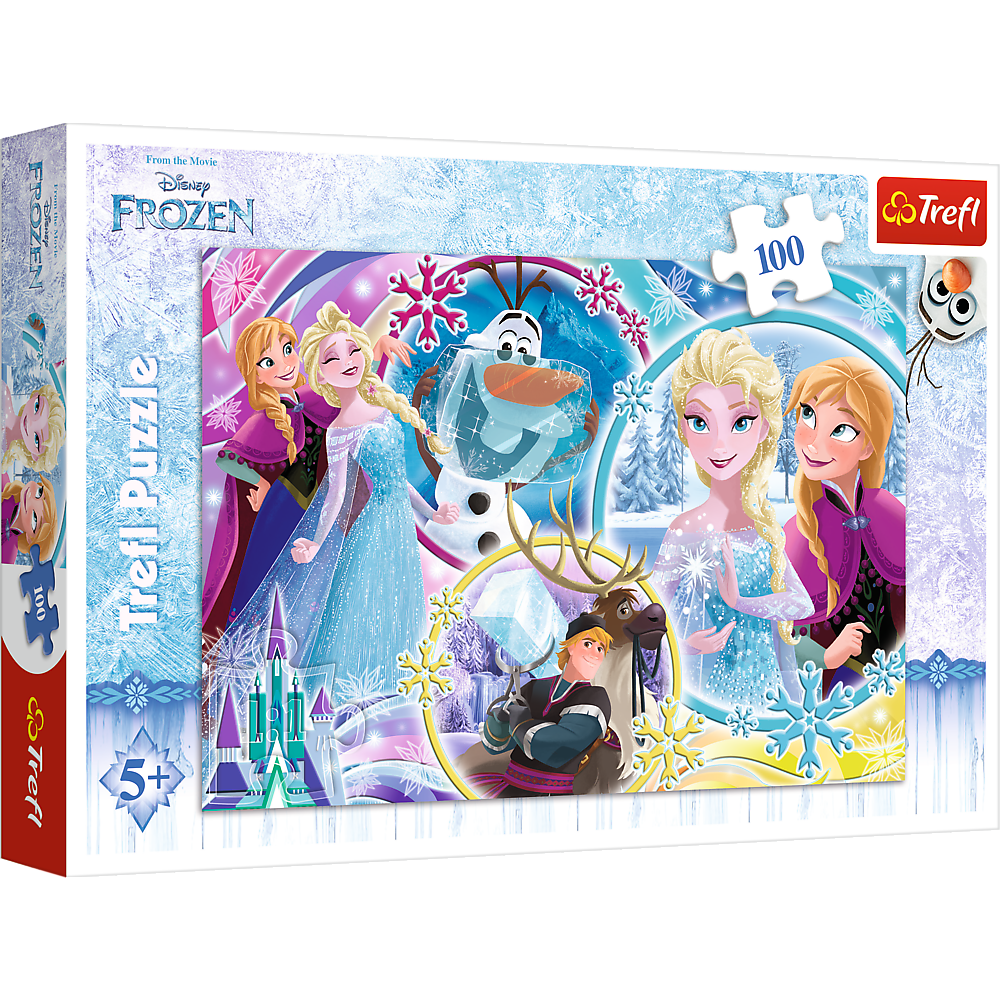 Puzzle 100 elementów z bohaterkami filmu animowanego Disneya "Kraina lodu". Po ułożeniu powstanie obrazek o wymiarach 41x27,5 cm. Wysoką jakość, nasycenie kolorów i bezpieczeństwo układania zapewnia kalandrowany papier odbijający światło i wykorzystanie materiałów ekologicznych.