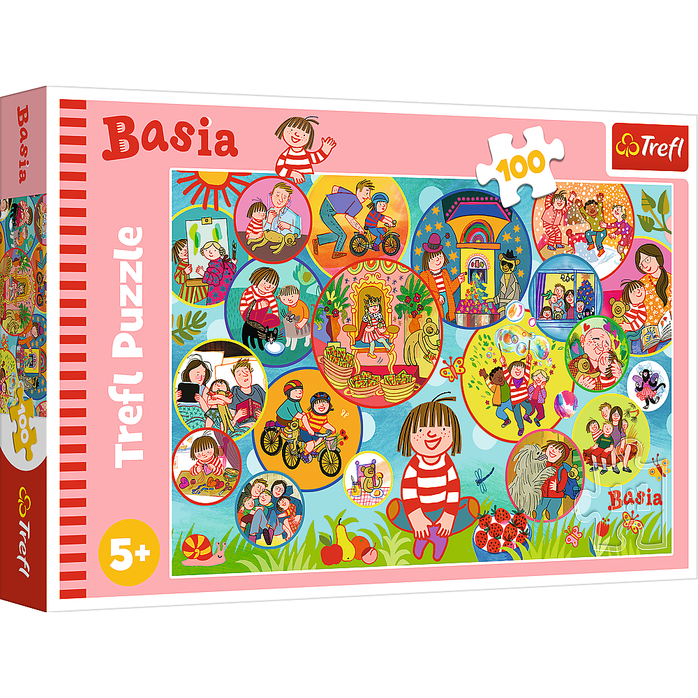 Puzzle ''Spędź dzień z Basią'' składające się z 100 elementów, zostały zaprojektowane z myślą o wszystkich małych miłośniczkach i miłośnikach puzzli. Po ich ukończeniu powstanie obrazek o wymiarach 410 x 275 mm. Precyzyjnie wykonane i idealnie dopasowane elementy oraz wysoka jakość nadruku sprawiają, że układanie jest łatwe i przyjemne, a sam obrazek po sklejeniu specjalnym klejem do puzzli Trefl może stać się wspaniałą ozdobą dziecięcego pokoju.