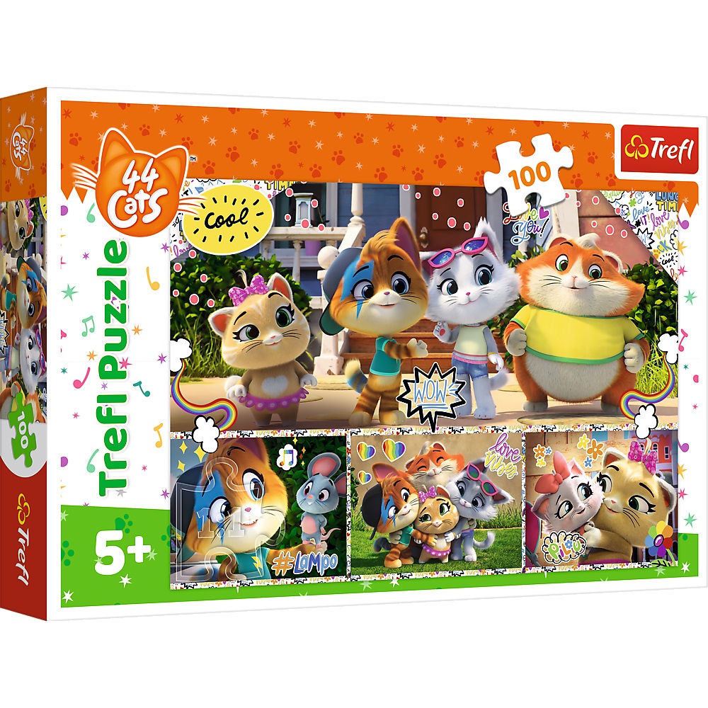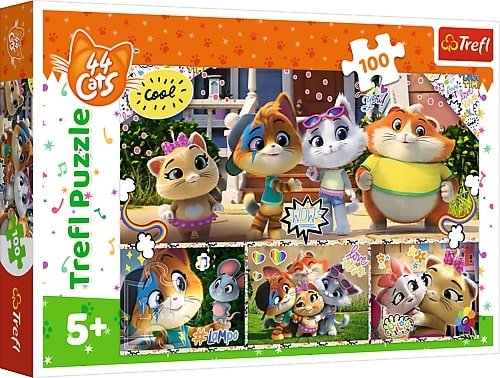 Wyjątkowe puzzle dla dzieci przedstawiają Zgraną ekipę przyjaciół, czyli uśmiechniętych bohaterów bajki animowanej 44 Koty (44 Cats). Zestaw puzzli składa się ze 100 elementów i umożliwia ułożenie barwnego obrazka o wymiarach 410 x 278 mm.