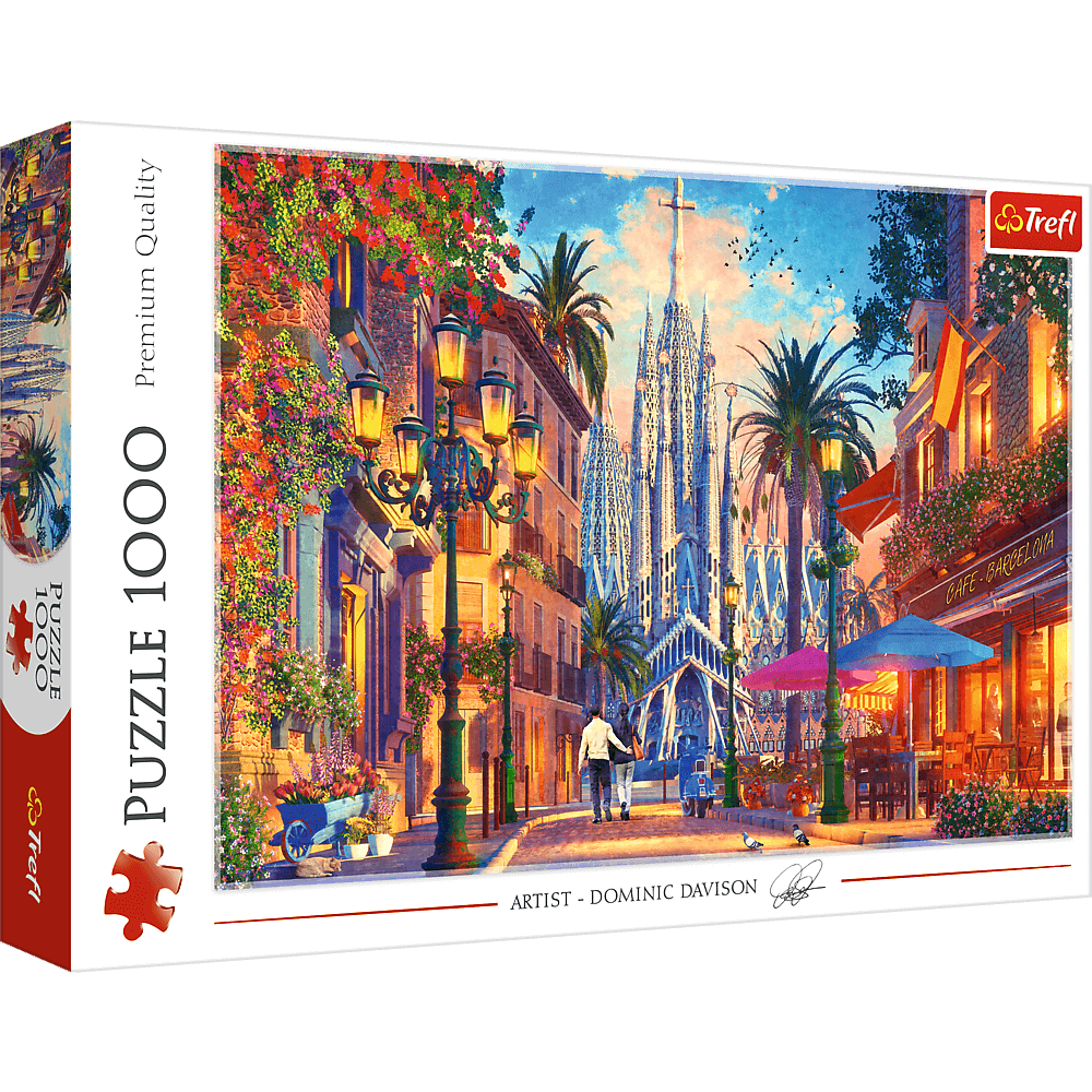 Puzzle 1000 elementów Barcelona, Hiszpania po ułożeniu stworzą obraz artysty Dominic Davison o wymiarach 683x480 mm. Ukazują hiszpańską uliczkę prowadzącą do znanej i imponującej bazyliki Sagrada Familia.