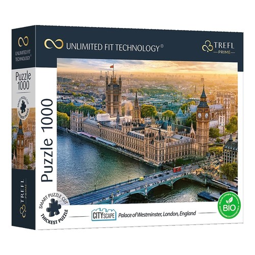 Puzzle z serii Trefl Prime UFT składające się z 1000 elementów są dedykowane prawdziwym miłośnikom układanek. Puzzle przedstawiają zachwycający widok na Pałac Westminsterski w Londynie. Po ułożeniu powstanie obraz o wymiarach 683x480 mm. Puzzle zostały wykonane z wysokiej jakości materiałów z zastosowaniem najgrubszej tektury, unikalnych kształtów oraz specjalnej metody cięcia. Dzięki temu możemy stworzyć indywidualny kolaż oraz łatwo przenieść całą układankę. Ponadto poszczególne elementy produktów UFT są wykonane z materiałów ekologicznych. Worek zsypowy oraz stickery na pudełku zostały wykonane z folii biodegradowalnej. Produkty nie są opakowane w folię termokurczliwą.