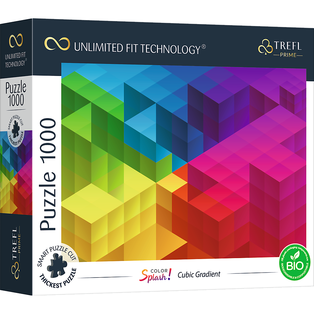 Puzzle z serii Trefl Prime UFT składające się z 1000 elementów są dedykowane prawdziwym miłośnikom układanek. Puzzle przedstawiają abstrakcyjny Cubic Gradient. Po ułożeniu powstanie obraz o wymiarach 683x480 mm. Puzzle zostały wykonane z wysokiej jakości materiałów z zastosowaniem najgrubszej tektury, unikalnych kształtów oraz specjalnej metody cięcia. Dzięki temu możemy stworzyć indywidualny kolaż oraz łatwo przenieść całą układankę. Ponadto poszczególne elementy produktów UFT są wykonane z materiałów ekologicznych. Worek zsypowy oraz stickery na pudełku zostały wykonane z folii biodegradowalnej. Produkty nie są opakowane w folię termokurczliwą.