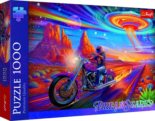 Seria DreamScapes przeniesie Cię do surrealistycznego, pełnego intensywnych kolorów, świata marzeń sennych. Puzzle DreamScapes: Szalona jazda, składające się z 1000 elementów, przedstawiają motocyklistę pędzącego przez pustynną autostradę, nad którą wznosi się statek kosmiczny. Po ich ułożeniu powstanie obrazek w rozmiarach 683x480 mm. Produkt wykonano w Polsce, przy użyciu wysokogatunkowych, ekologicznych materiałów. Specjalny kalandrowany papier odbija światło, co ułatwia układanie.