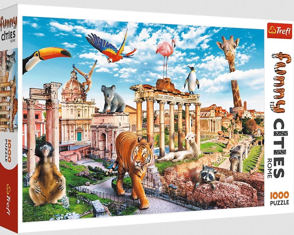 Dziki Rzym to puzzle z serii Funny Cities składające się z 1000 elementów przedstawiające zabawny widok na jedno z bardziej znanych, włoskich miast wraz z zwierzątkami. Po ułożeniu powstanie obrazek o wymiarach 683x480 mm.