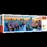 Panoramiczne puzzle 1000-elementowe ze zdjęciem przedstawiającym Miami o zmroku. Po ułożeniu powstanie obrazek o wymiarach 97x34 cm. Wysoką jakość, nasycenie kolorów i bezpieczeństwo układania zapewnia kalandrowany papier odbijający światło, pokryty ekologicznymi farbami spożywczymi.